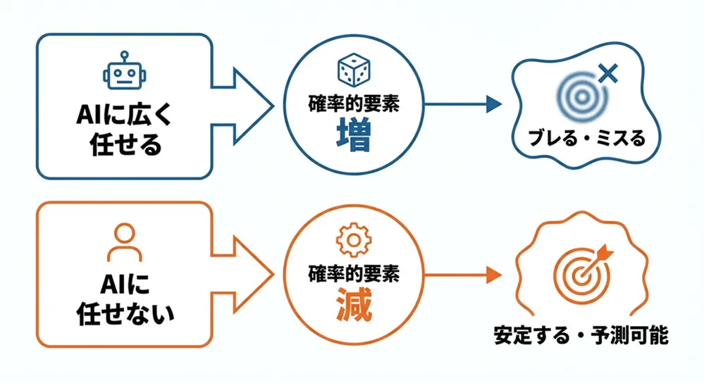 AIに任せる範囲が広いほど、確率的な要素が増えます。逆に、任せる範囲を限定すれば、確率的な要素は減ります。