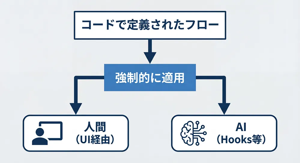 人間は、承認フローやレビュープロセスといった「コード外」の仕組みで統制が実現されてきました。しかし最近では、これらもコード寄りになってきており、CI/CDで承認ステップを強制したり、PRがないとマージできないようにしたりしています。 一方で、AIは最初から「コード」で制御できます。Hooksやスキーマを使えば、運用ルールではなくシステムとして制約を埋め込めます。