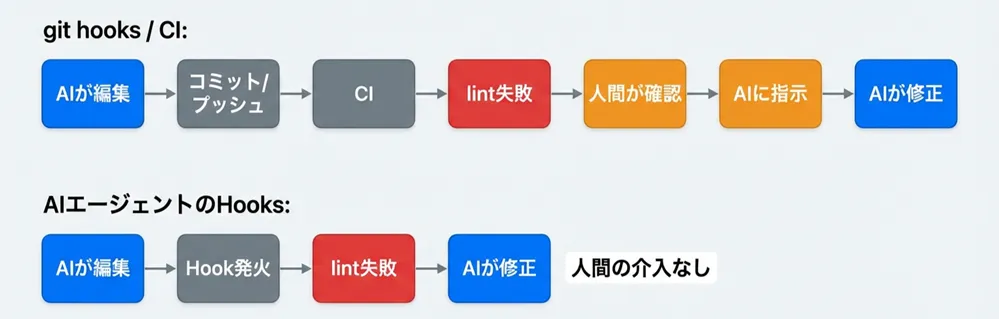 git hooksやCIでも似たようなことはできます。ただし、これらはAIの作業が終わった後に動きます。問題が見つかっても、人間がAIに「直して」と指示し直す必要があります。